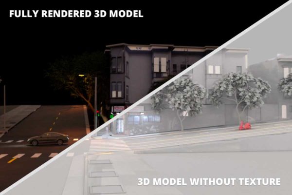 When laser scans are available, or when our clients request that we capture a scene using our own equipment, such options make the work of a 3D modeler much easier. Depending on the resolution of the scans available, it may be possible to use the scans directly as a 3D context, or more likely, the scan can be used as a layer for a designer to model around and over (a kind of 3D tracing if you will). With the scan set imported into 3D modeling software, the designer can basically trace every denoted aspect of the scene relevant to the case, using the scan(s) as a foundational background to create a highly realistic 3D model. The designer can size all the buildings, windows, doorways, street lamps, sidewalks, etc., found within the laser scans, and provide a simple, optimized version of the scene that is easy to understand. When the model is complete, any expert on the case can verify that the model is accurately representing the scene by comparing the original scans’ underlying dataset to that of the 3D model recreation.